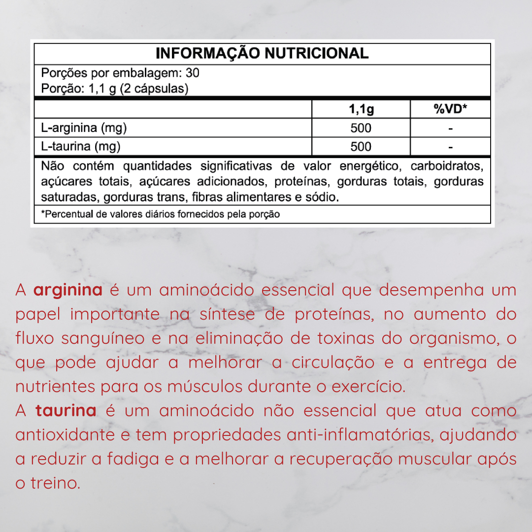 É um suplemento desenvolvido para aqueles que buscam melhorar seu desempenho físico e mental. A arginina, um aminoácido essencial, desempenha um papel fundamental na síntese de proteínas, no aumento do fluxo sanguíneo e na eliminação de toxinas do organismo. Isso resulta em uma melhor circulação e na entrega eficiente de nutrientes para os músculos durante osexercícios. A taurina, por sua vez, é um aminoácido não essencial que atua como antioxidante e possui propriedades anti-inflamatórias, ajudando a reduzir a fadiga e a melhorar a recuperação muscular pós-treino.