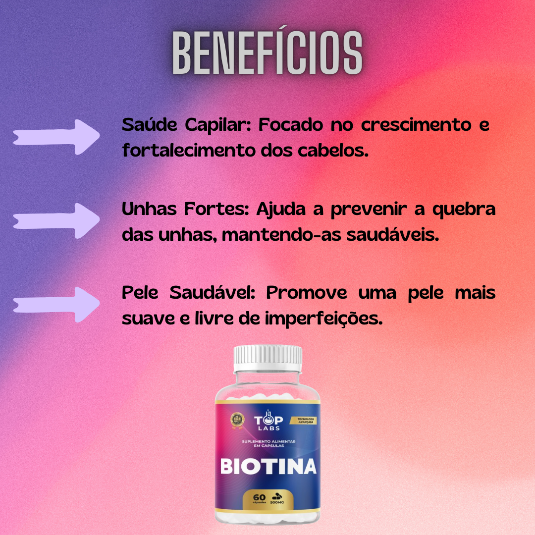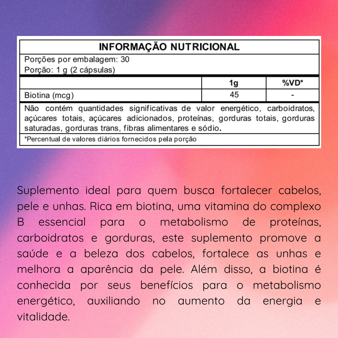 É um suplemento essencial para quem deseja fortalecer cabelos, pele e unhas. Rica em biotina, uma vitamina do complexo B, este produto desempenha um papel crucial no metabolismo de proteínas, carboidratos e gorduras. A biotina não apenas promove a saúde e a beleza dos cabelos, mas também fortalece as unhas e melhora a aparência da pele. Além de seus efeitos estéticos, a biotina é conhecida por suas propriedades que auxiliam no aumento da energia e vitalidade, tornando-se um aliado poderoso para o bem-estar geral.
