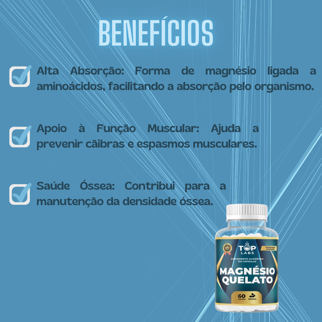 Ø Fácil absorção: A forma quelada proporciona uma melhor biodisponibilidade, garantindo que o organismo absorva o magnésio de maneira eficiente.