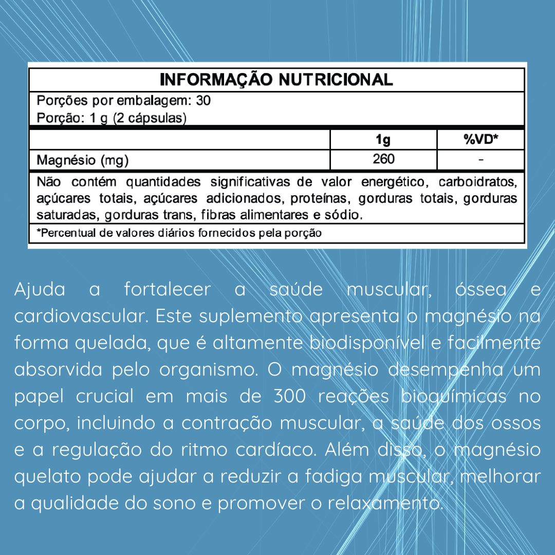 É um suplemento inovador que fortalece a saúde muscular, óssea e cardiovascular. Apresentado na forma quelada, este magnésio é altamente biodisponível, o que significa que é facilmente absorvido pelo organismo. Este mineral essencial participa de mais de 300 reações bioquímicas no corpo, desempenhando papéis cruciais, como a contração muscular, a manutenção da saúde dos ossos e a regulação do ritmo cardíaco. Ideal para quem busca um suporte eficaz para a saúde geral.